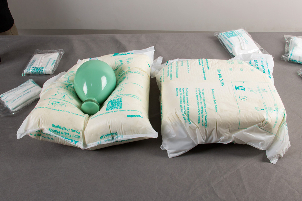 Selepas tu, cepat-cepat letak beg foam ni dalam kotak bersama barang anda. Biarkan ia expand fully untuk fill semua ruang kosong. Kami recommend guna 2 beg untuk 1 produk—satu di bawah, satu di atas—untuk maximum protection. Dalam masa 2-3 minit, foam akan keras dan jadi cushion yang solid. Siap! Barang anda dah protected macam professional courier company punya standard.